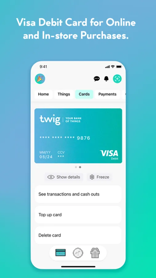 Twig is a Visa Debit card secured. You'll be able to instantly make online or in-store purchases with your free Visa Debit card. Your Twig card is the only free Visa Debit card powered by your old things, so you can enjoy purchases at your favorite stores, websites, apps, restaurants, and more.