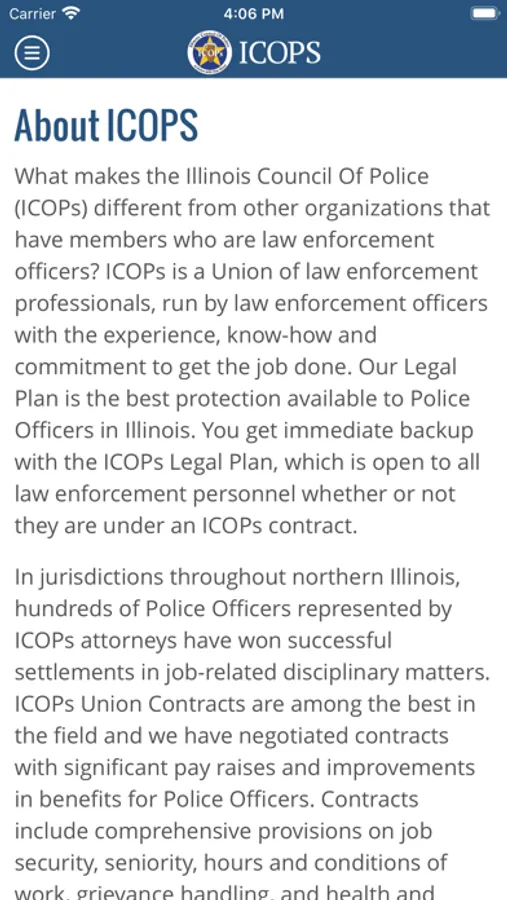 This app is intended as a communications tool for members of the Illinois Council of Police, its leadership and the citizens they serve. To that end, the app includes the following: