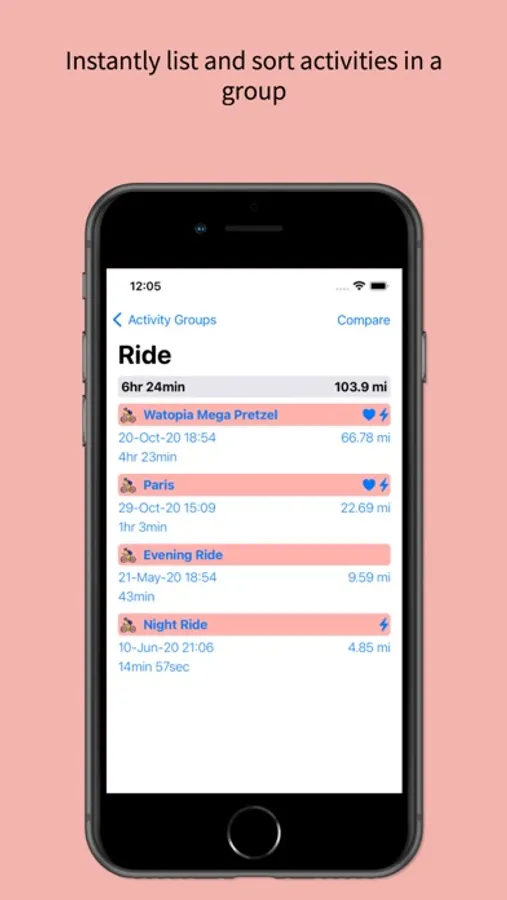 Show your activities sorted by date, distance, moving or elapsed time, elevation gain, average speed and more.