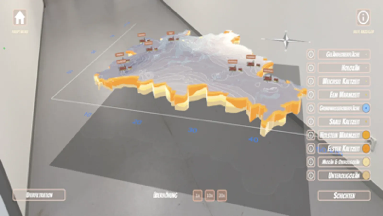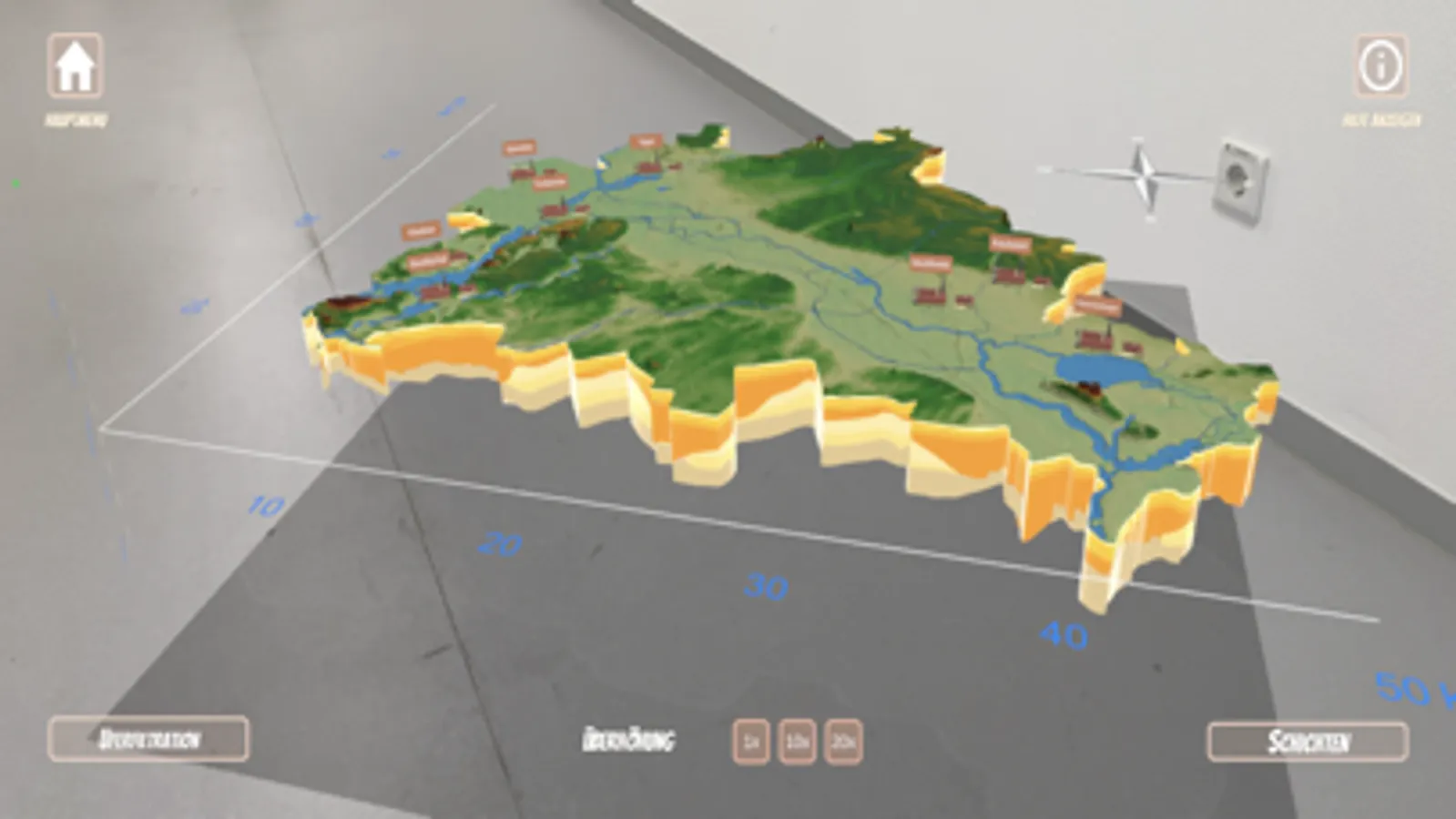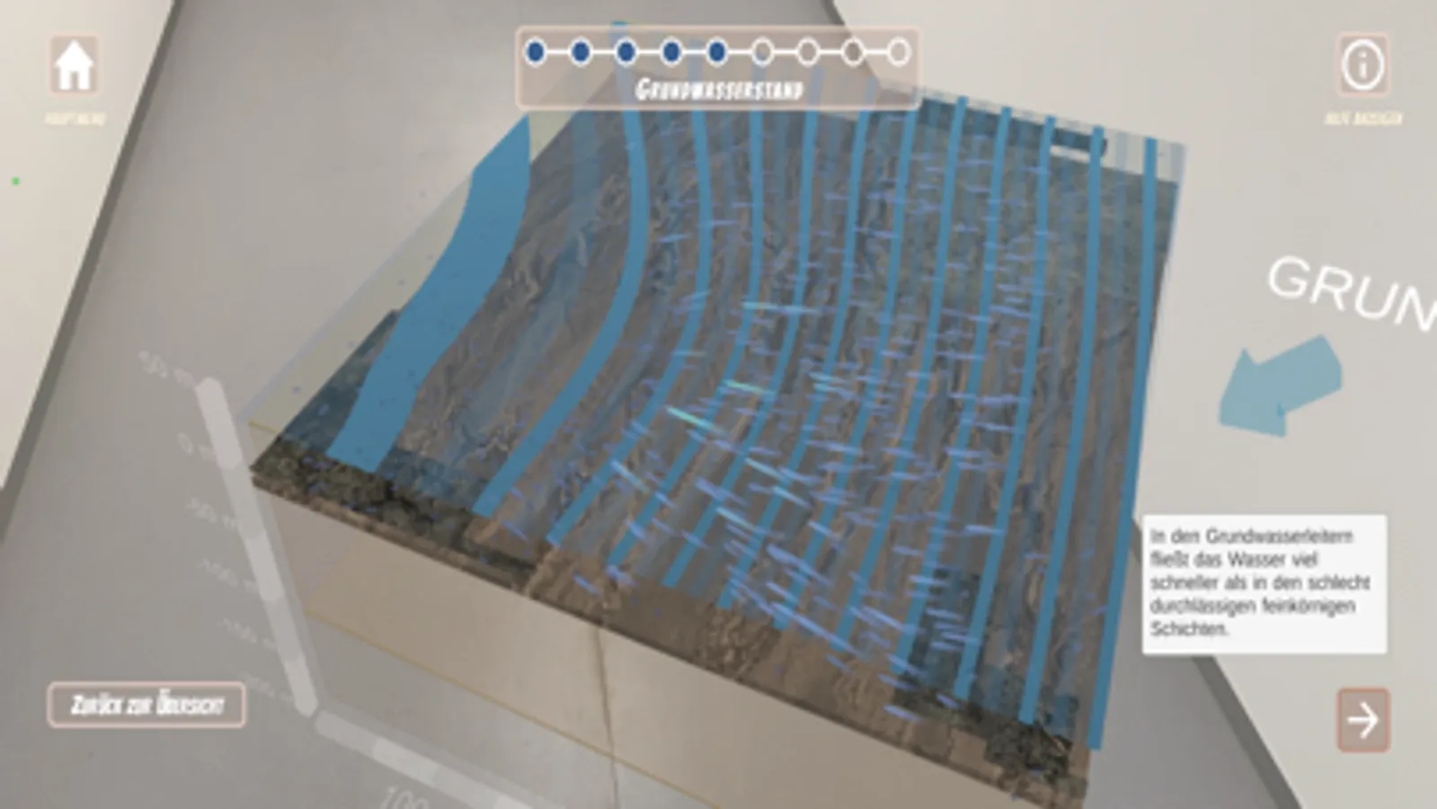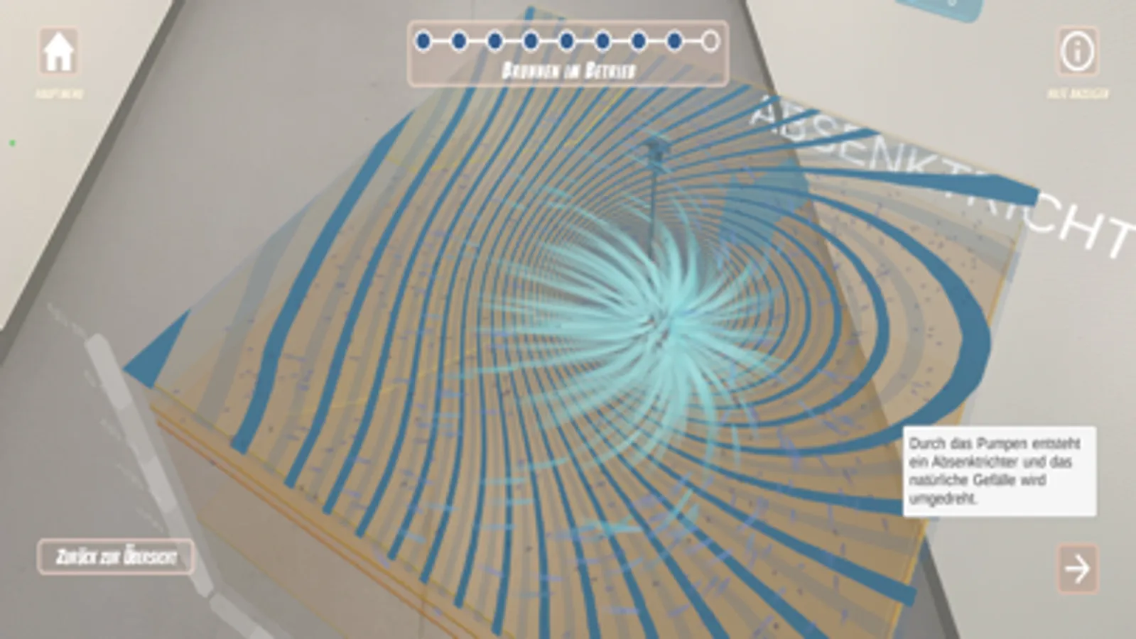 Bei dieser App handelt es sich um einen Prototypen. Sie wurde entwickelt, um Prozesse zum Thema Grundwasser mittels Augmented Reality (AR) sichtbar zu machen. Sie zeigt verschiedene Elemente des Untergrunds, wie geologische und hydrologische Schichten und veranschaulicht die Grundlagen der Trinkwassergewinnung anhand eines fiktiven Brunnens.