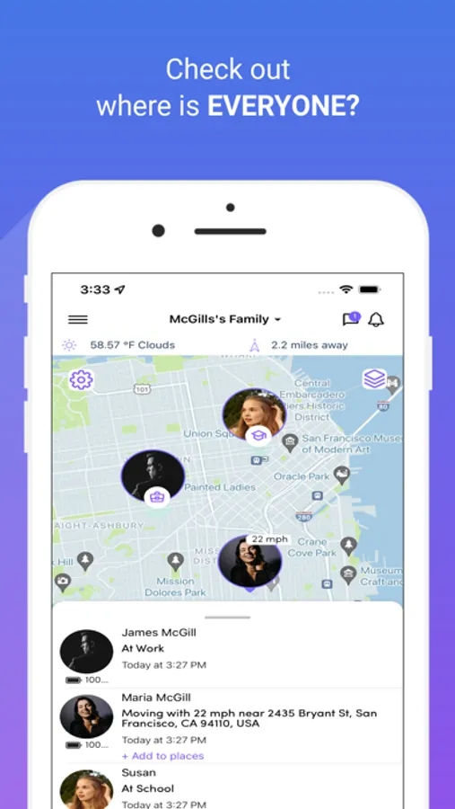 Family360 uses GPS coordinates and state-of-the-art GPS location data to report the real-time spots of your family. No need to send annoying "Where are you?" texts. The Family360 puts this information at your fingertips.