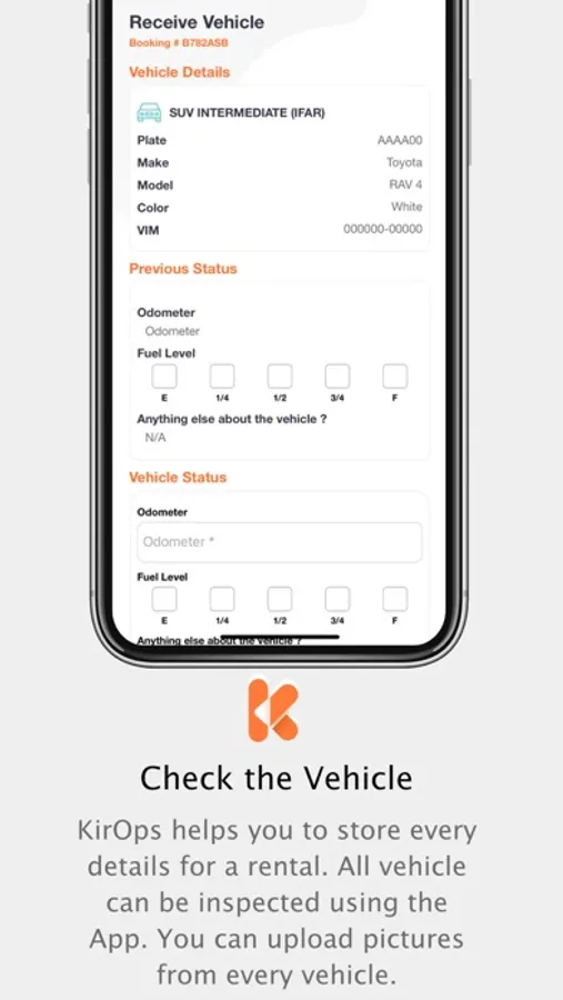 With KirOps App you can create new rentals for your customers, inspect the vehicle to start or to finish a rental. You can include up to 6 pictures from the vehicle in each case.