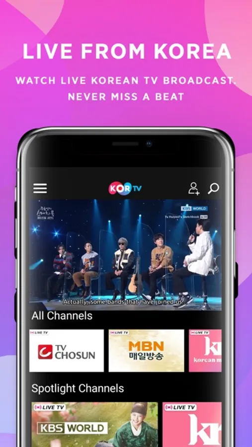 KORTV is the global destinaKORTV is the global destination for live Korean entertainment. Stream live broadcasts from the leading Korean television networks such as KBS World, TV Chosun, Arirang TV, and watch the latest movies and shows on-demand!