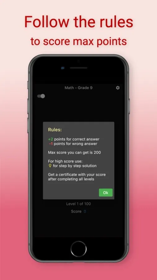 There are 100 questions/levels sprinkled with some interesting Math puzzles in between. Create and share a certificate of your final score. Challenge your friends and family to see who can score the most.