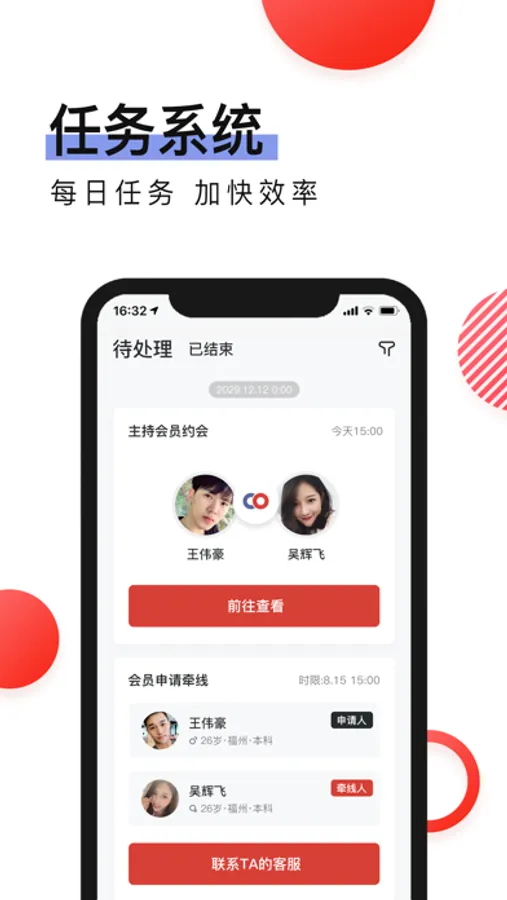 握住良缘是深圳我主良缘信息科技有限公司研发,专门供红娘人员使用的牵线端工具。握住良缘APP可以协助红娘人员。销售人员进行客户沟通,视频牵线等服务。等服务。