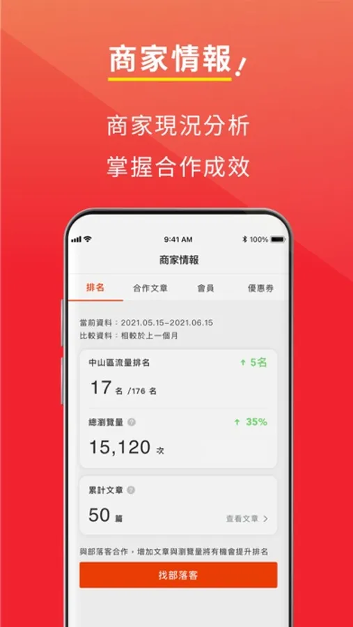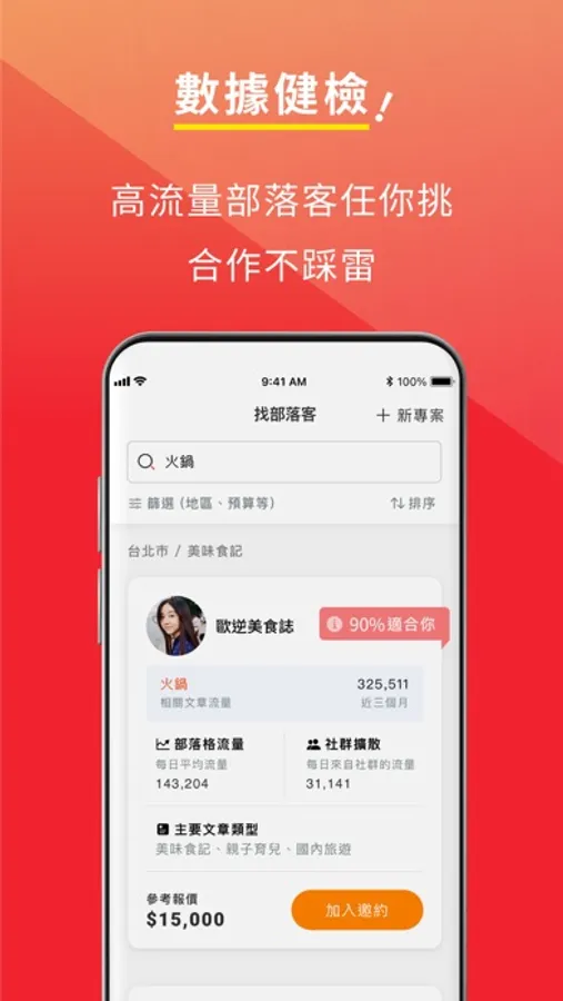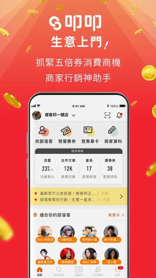 使用「叩叩」服務,系統自動推薦最適合部落客人選,從邀約、聯繫、過稿到上線,都能透過 App 完成,還有發送優惠券、集章卡等行銷工具,無需透過行銷公司,幫您省時又省力。