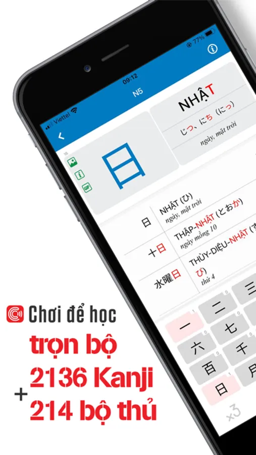 ● 2136 + 214 Bộ thủ Kanji được sắp xếp theo từng block 20 và phân cấp độ từ N5, N4, N3, N2 đến N1, giúp bạn chủ động chọn lựa nội dung muốn học. Mỗi chữ Kanji gồm đầy đủ từ Hán – Việt, Nghĩa trong tiếng Việt, Nguyên tắc chuyển âm cùng Từ vựng phong phú luôn được cập nhật.