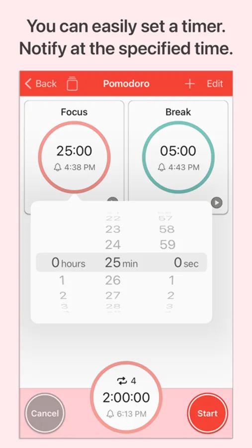 The operation of Timers is very easy. Edit the timer name, time, sound, and repeat settings. All of them can be done simply and easily. After setting the timer, tap the start button. When the time is up, you will be notified with a sound. Background notifications are also supported, so you can use it even when your device is locked. It can also be used while music is playing.