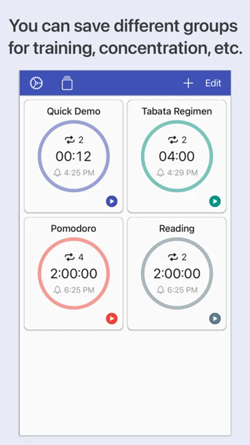 Timers allows you to save multiple groups. Study, exercise, strength training, meditation, reading, Pomodoro technique, cooking. Create a timer that suits your needs and focus on your goals.