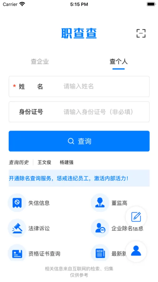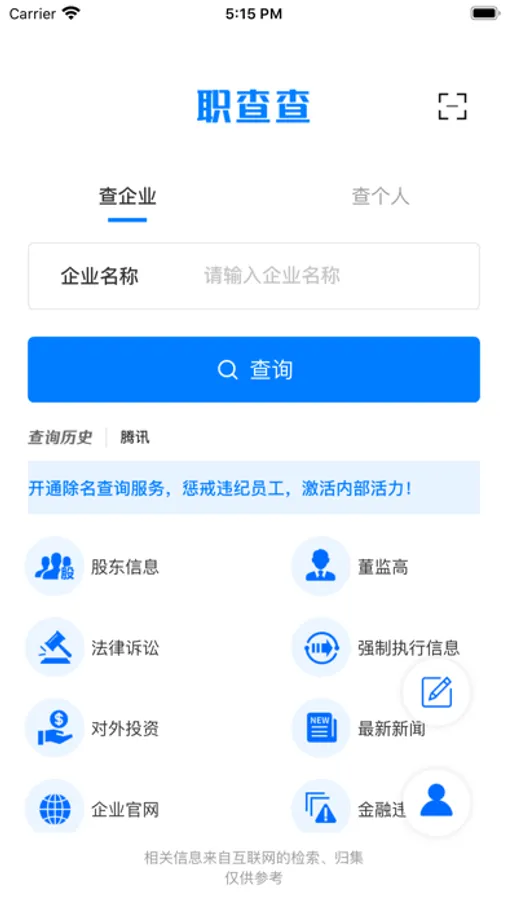 职查查是市面上第一款,围绕职场人士,进行各自资讯、信息归集的APP。