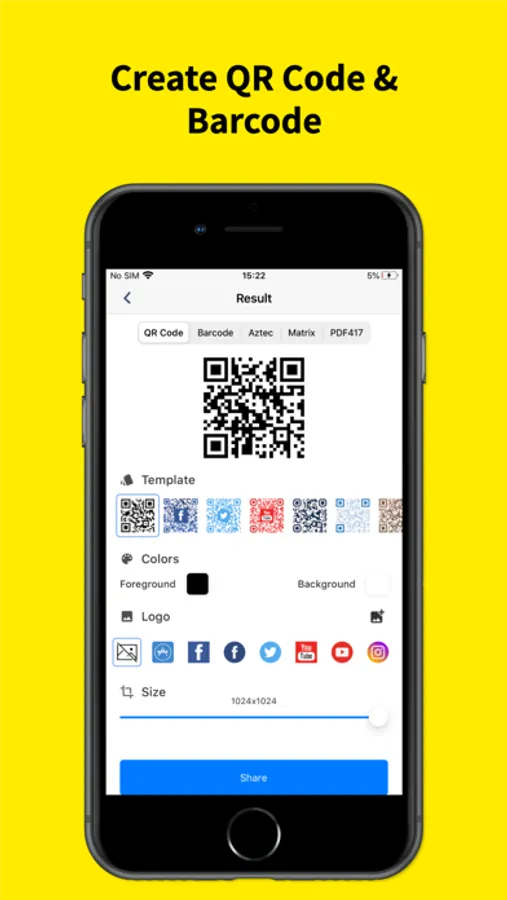 More than 15 types supported : QR Code, Barcode, Datamatrix, Code128, Code39, EAN-8, EAN-13...