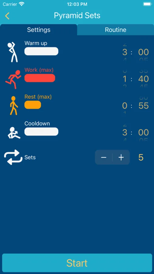 Flat Sets include a Warm up, Cool down and repeating alternate sets of Work and Rest intervals. You can select the number of Work and Rest sets as well as the standard duration of each type.