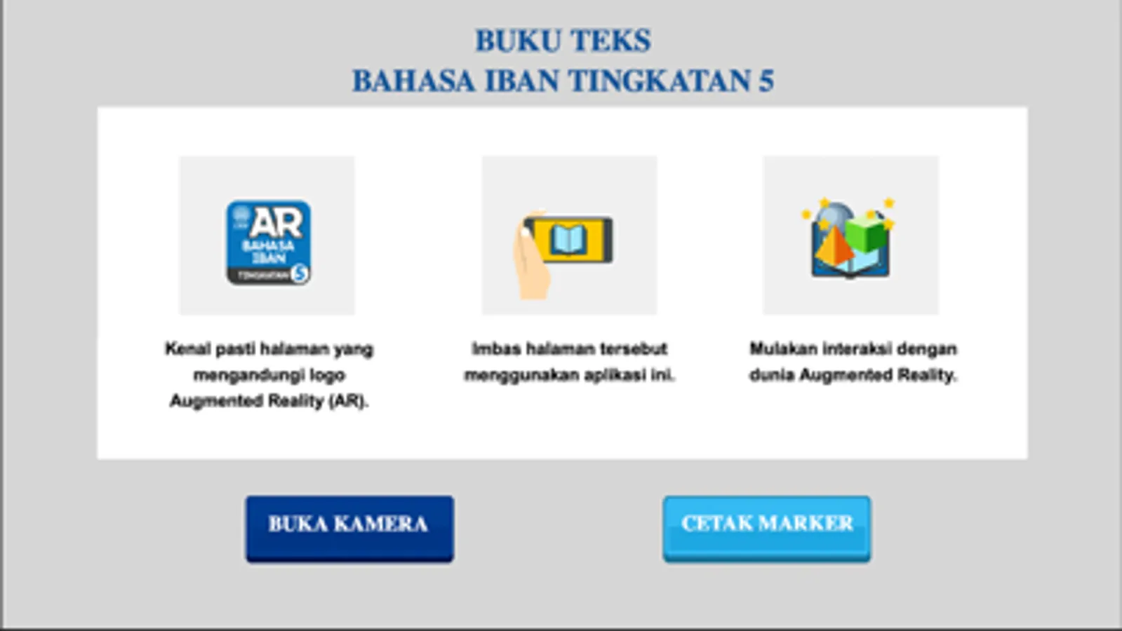 Aplikasi ini merupakan aplikasi Augmented Reality (AR) bagi Buku Teks Bahasa Iban Tingkatan 5 terbitan Dewan Bahasa dan Pustaka.