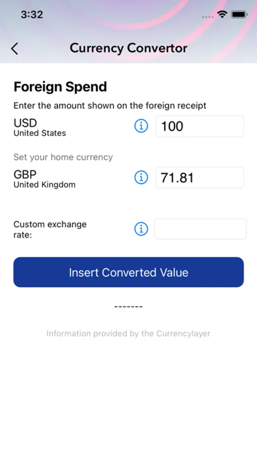 Currency Override - Didn't get today's bank rate when you exchanged? Not a problem, manually override the currency to the rate received.