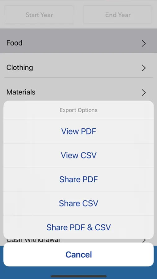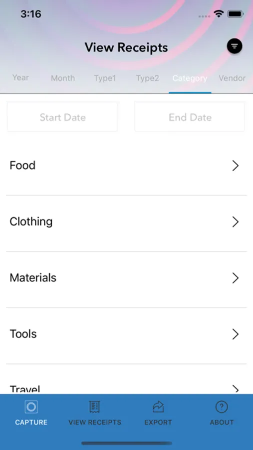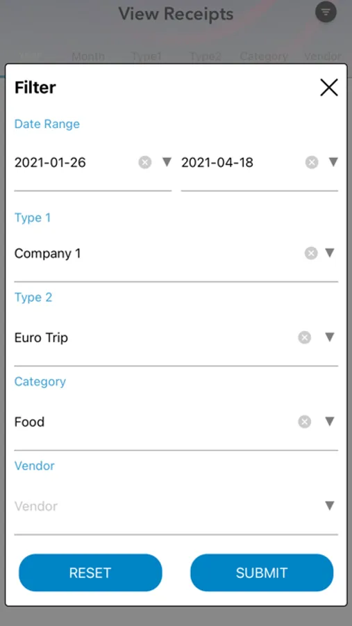 Export by year, month, type 1, type 2, category, or vendor and add date filters to export only the receipts you want.