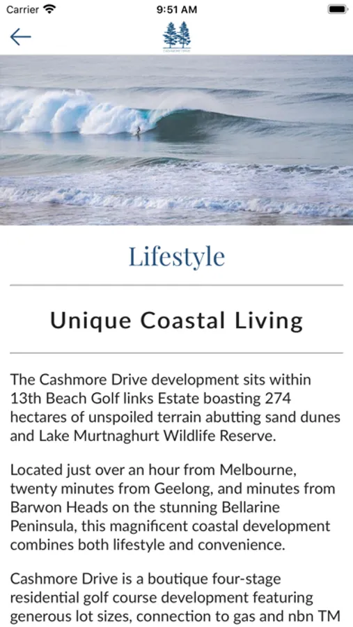 Cashmore Community is a residential estate within the 13th Beach golf & residential community located in Barwon Heads Victoria. It incorporates approximately 130 residential properties and a 9 hole private golf course and golf academy. This app provides owners within the 13th Beach Cashmore Community with all of the latest information and access to documentation for their community.