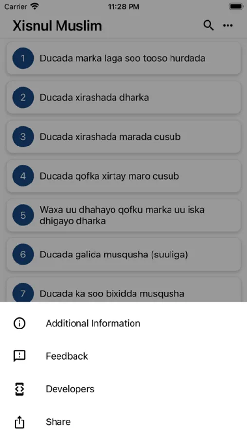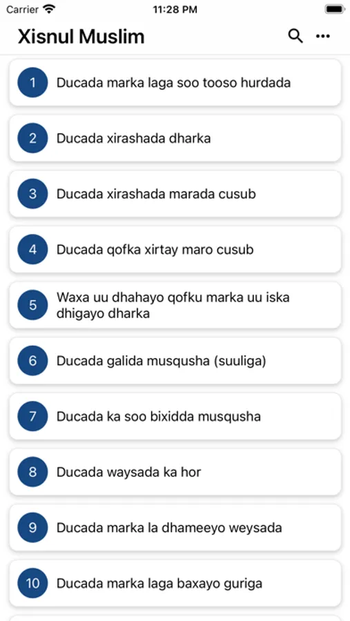 App-kan waxa ku jira Ducooyinka iyo Adkaarta kitaabka Xisnul Muslimka,