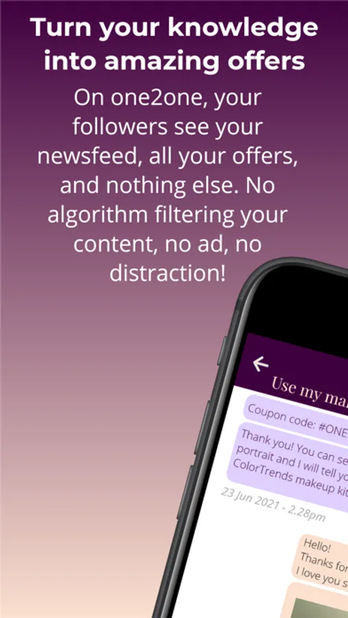 one2one complements social media by facilitating genuine discussion, enabling interactive offers, and sharing expert advice. one2one is deployed in apps free to install and easy to use. There is no advertisement on the app, data tracking, or other annoying aspects of social media. It is you and your fans only.