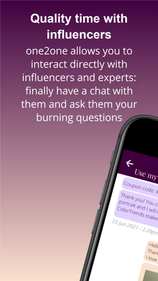 one2one complements social media by facilitating genuine discussion, enabling interactive offers, and sharing expert advice. one2one is deployed in apps free to install and easy to use. There is no advertisement on the app, data tracking, or other annoying aspects of social media. It is you and your favorite influencers only.