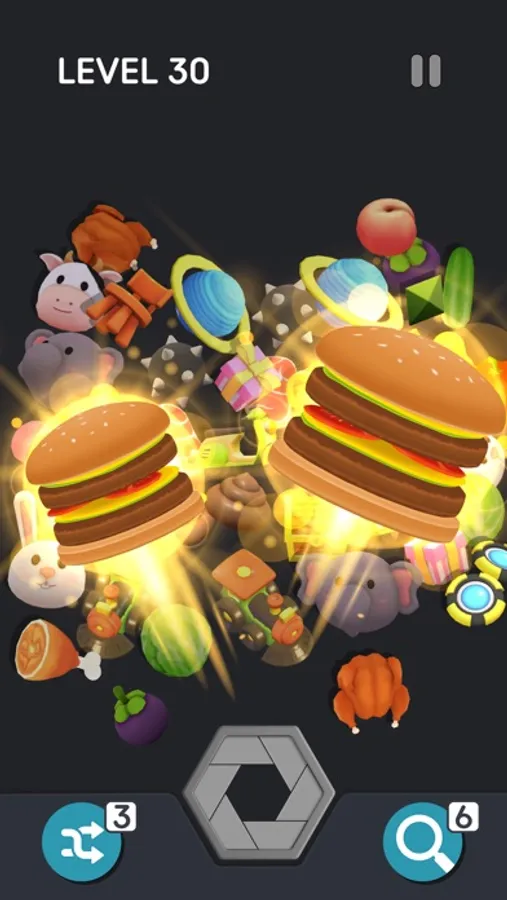 Find two identical 3D objects and move them to the Hexagon to match them.