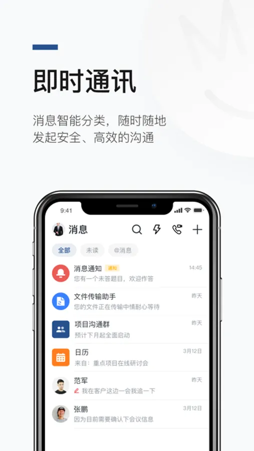 专注于组织工作领域,提供文字、语音、图片、视频、文件、在线文档等多种功能,让团队沟通所有需求集中产生在同一个地方并永久保存。