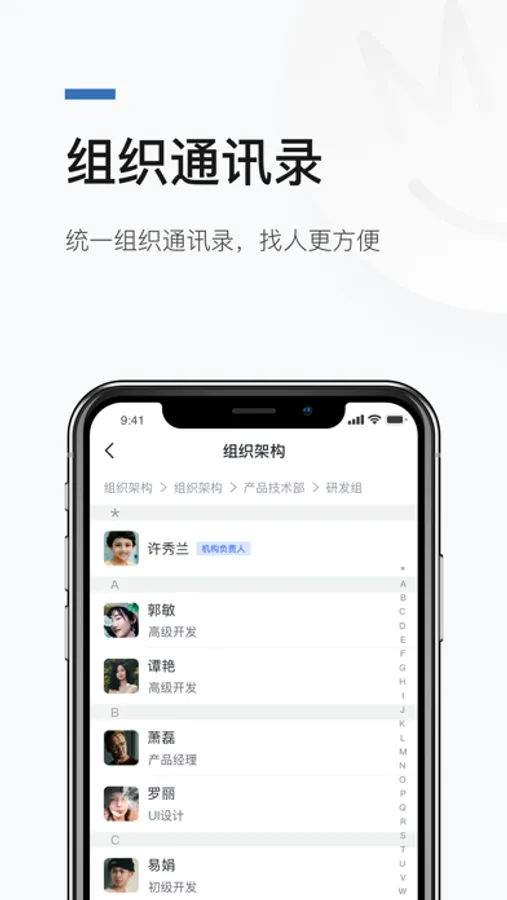 支持组织通讯录、成员聊天信息、组织共享文件等所有信息的统一搜索并随时呈现。