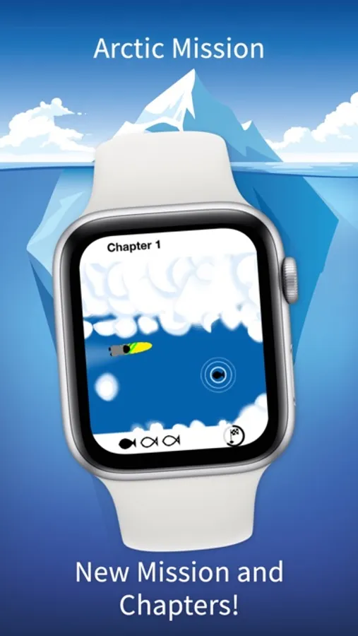 Arctic Mission features a little story with 2 missions, 5 different "ships" to play through 16+10 chapters with various weather conditions. It is the best way to kill a few minutes on your wrist since our first Apple Watch project: Radar Game.