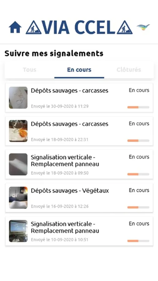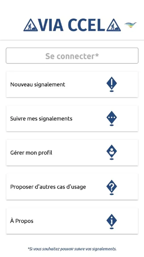 L'application mobile VIA CCEL permet de signaler les problèmes liés à des phénomènes présents sur la voirie (dépôts sauvages, nids de poule, etc...). Les utilisateurs peuvent déclarer ces problèmes à partir d'une photo, d'une localisation et d'une description.