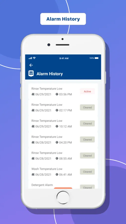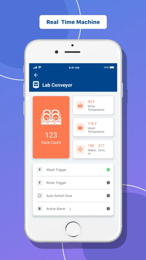 - Access real-time dashboards to monitor: rack counts, concentration readings/set points, alarms & triggers, wash & rinse temperatures, and pump priming