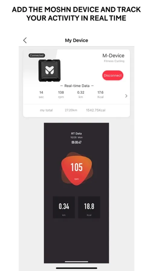 The app uses common Bluetooth connection and your phone's proximity to the MOSHN smart device to connect and track your cadence, distance, time spent active, steps and estimated calorie burn.