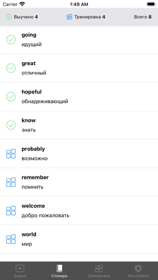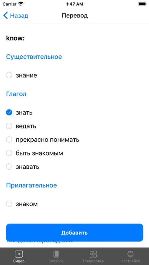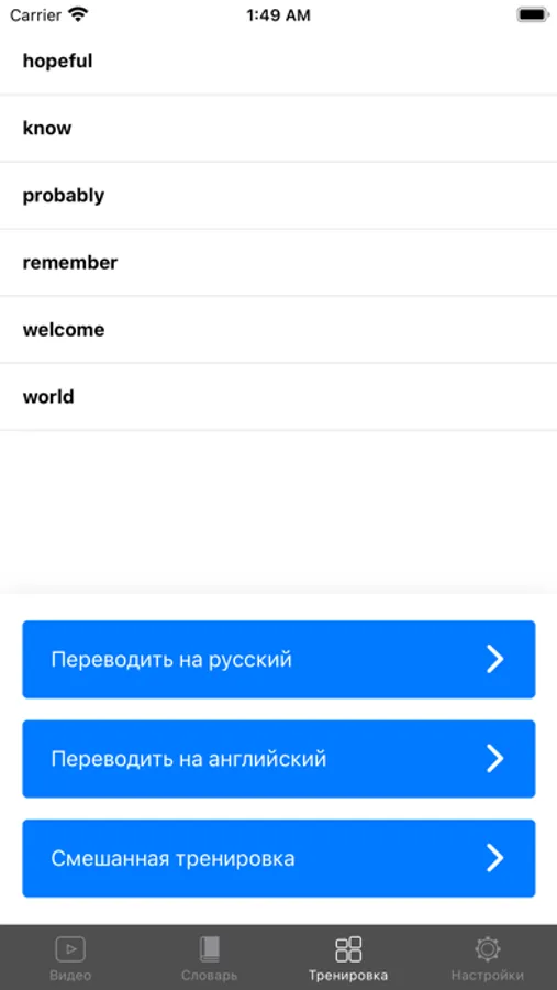 Если во время просмотра видео вы увидите неизвестные вам слова, то не обязательно открывать английский словарь. Достаточно нажать на слово и появится его перевод, который вы можете добавить в свой личный словарь, расширив словарный запас. Так же в программу встроена тренировка слов, с помощью которой вы сможете запоминать английские слова. Советуем придумать свой ритм, чтобы учить английские слова, например выучить 90 слов за неделю, или запомнить 1 слово в день. Тогда новые слова на английском будут систематически пополнять ваш словарный запас. Чтобы вы могли учить английские слова, мы предусмотрели несколько вариантов тренировки слов - перевод с английского на русский, с русского на английский, смешанная тренировка.