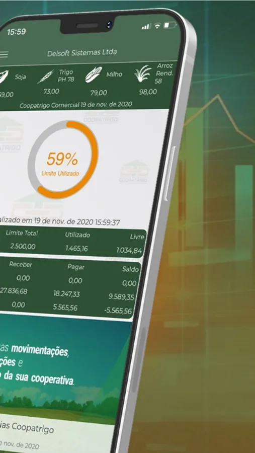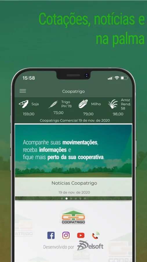 Dentro do aplicativo, é apresentado valores atuais dos grãos, últimas notícias da cooperativa, títulos financeiros e muito mais.