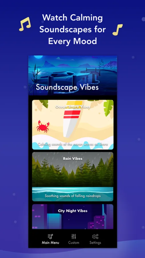 Discover hand-illustrated landscapes and unwind to soothing nature sounds. Watch simple animations as you listen for stress relief, relaxation, better sleep and more.