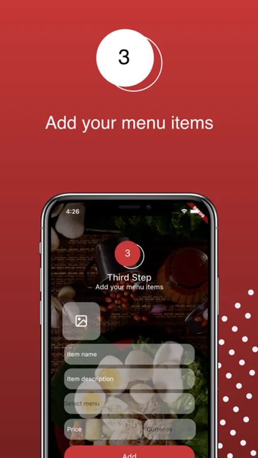 InvoSnack App provides an easy way for restaurant owners to create menus and add items with different details like name, image, description, price, and the price currency.