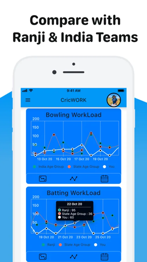You can see the Graphs of all your Workload types, to Compare with Top Professional Players. For Eg. Know the Average Batting Workload of your State Association Players and compare if you Bat for more number of Balls or less through the weeks and months. Know how many balls do the top Bowlers bowl in a month to maintain the level of Professionalism required.