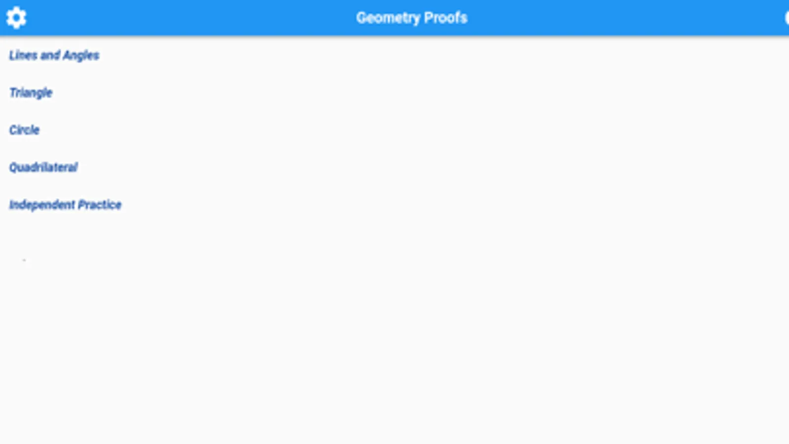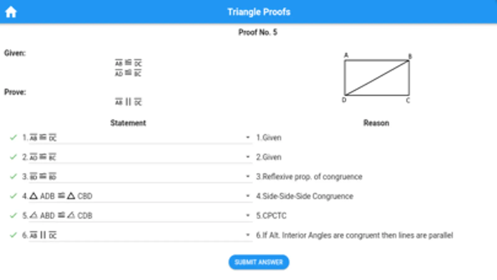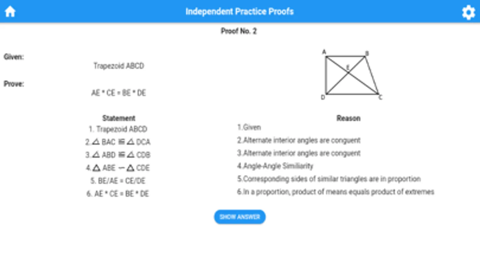 This app includes 45 Two Column Geometry Proofs that you can solve. There are four categories of proofs, Lines & Angles, Triangles, Circles, and Quadrilaterals. You can choose to solve by selecting the Reasons or by selecting the Statements. There are also Independent Practice proofs that you solve yourself and then compare your solution to the answer.