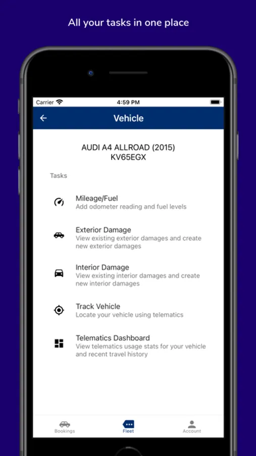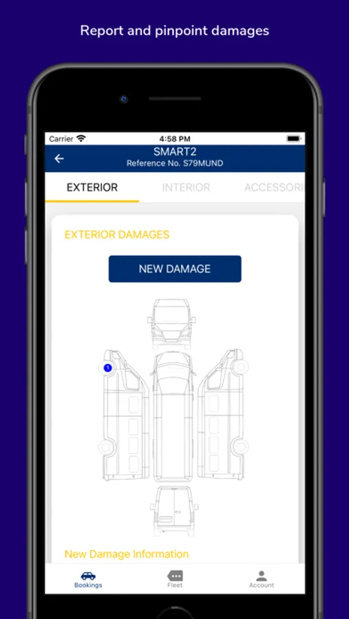 Report new damages and view existing exterior and interior damages, upload vehicle damage images to pinpoint the location