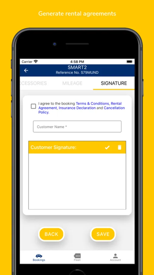 Enter and view odometer and fuel details, take customer signature on the app before the start and close of bookings