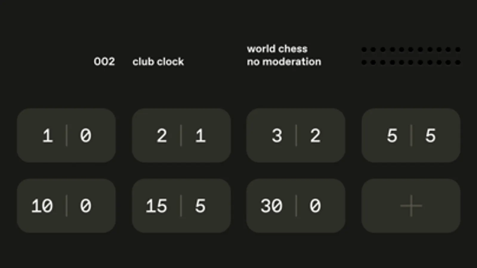 Meet the Club Clock — the first chess clock designed for modern gameplay. Simple, customizable, and built for the speed of bullet, blitz, and rapid. Part of a special partnership between World Chess and No Moderation.