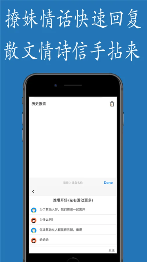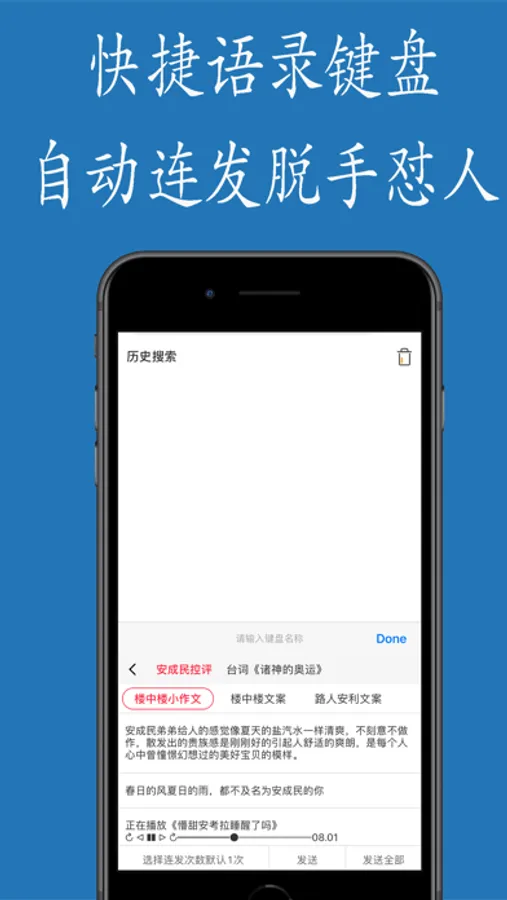*社交聊天中通过键盘内置的搜索快速发送经典台词和散文句子.