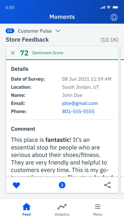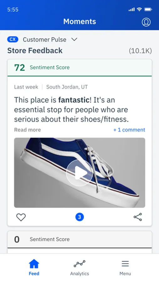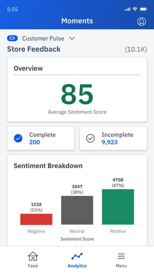 Users can drill down by account or program and quickly access saved views and collections of customer feedback spanning multiple data sources. The application transforms simple metrics into meaningful data and offers insights into feedback sentiment, and keywords and topics customers are talking about most. With Moments mobile, users get the insight they need to take action on-the-go.