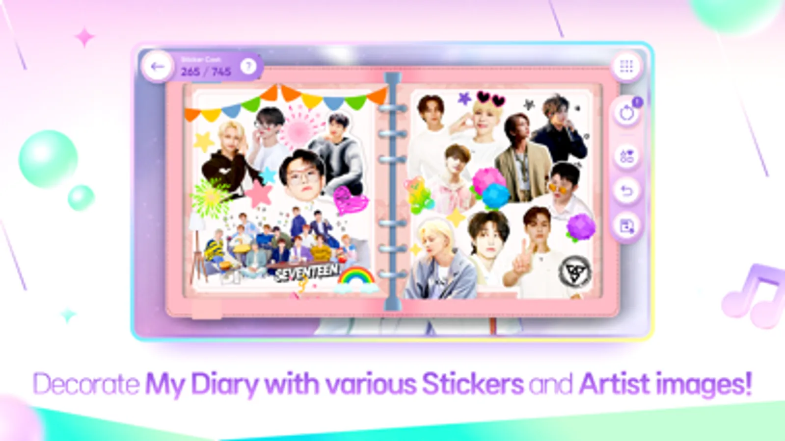 Create your own Diary theme consisting of album covers and cute and cool moments of Artists, and decorate it with stickers!