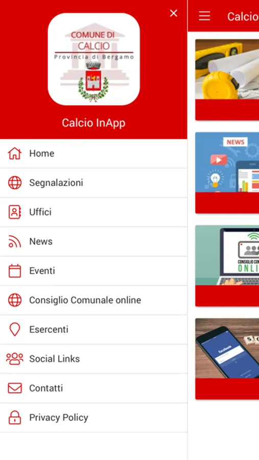 Calcio InApp è il nuovo modo di creare comunicazione tra ente e cittadino; in tempo reale l'applicazione fornisce aggiornamenti sulle news e comunicazioni “PUSH”. Gli utenti potranno visionare il calendario con gli eventi geolocalizzati in programma, e, dopo essersi registrati, inviare segnalazioni agli uffici comunali.