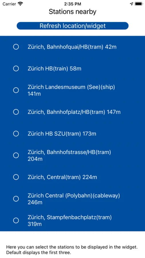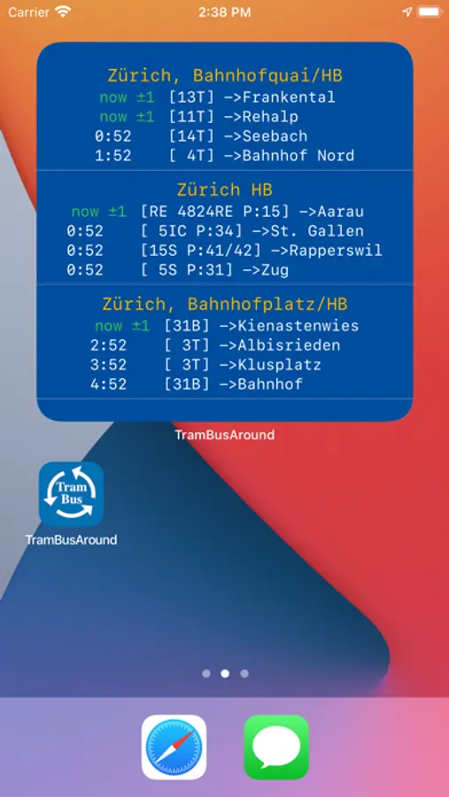 The timetable widget shows in real-time the trams, buses and trains schedules of the nearest stations sorted by the distance in Switzerland. You can see the remaining time timer, route number,platform and direction. You can add filters (“Edit Widget”) to station and line names.