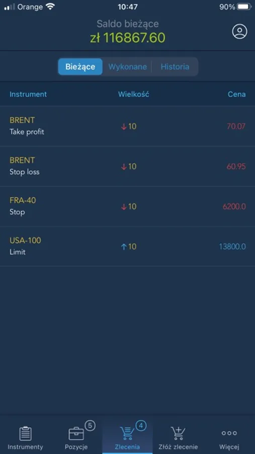 - alerty dotyczące zamknięcia, modyfikacji czy wykonania zlecenia