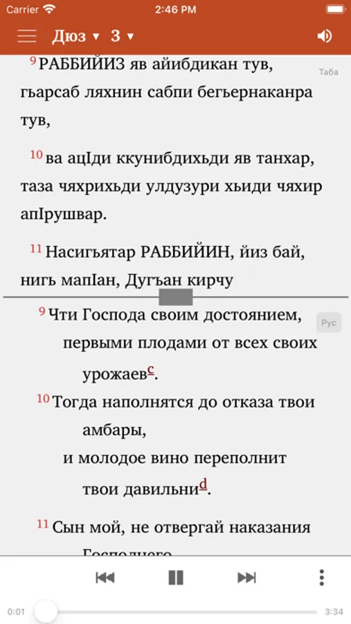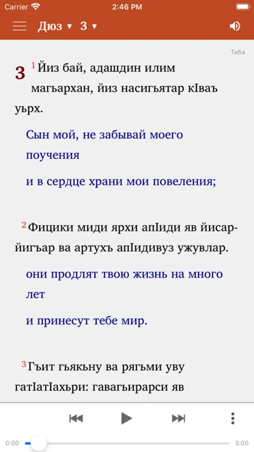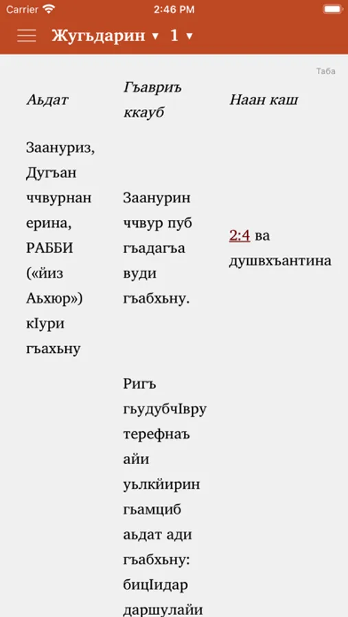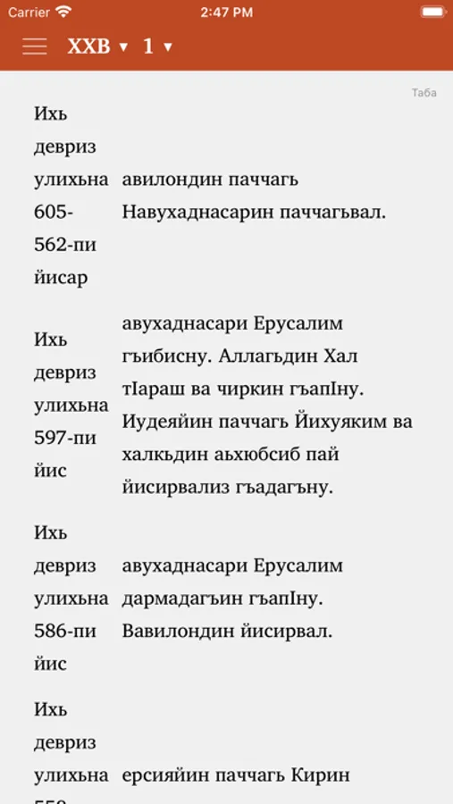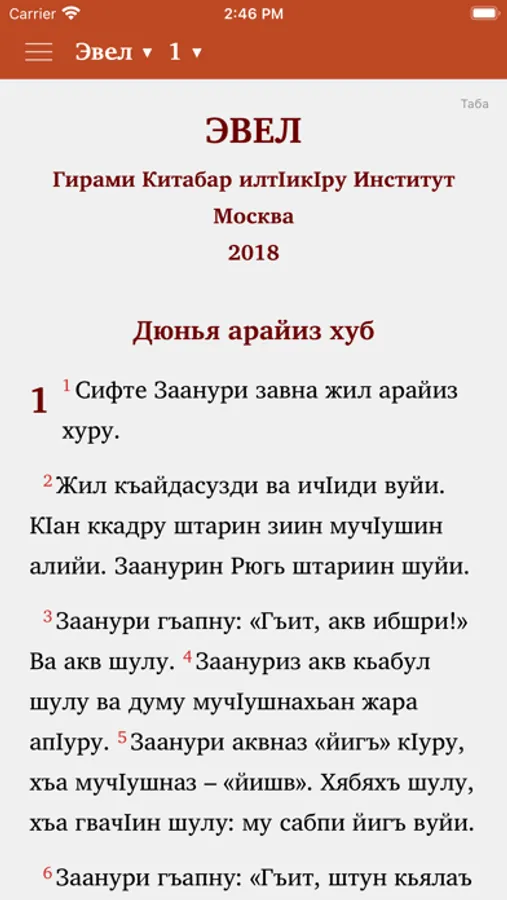 This Scripture app facilitates Bible study in the Tabasaran language. The Russian translation (NRT) can optionally be added in parallel to the Tabasaran text. Users can highlight verses in different colors, make bookmarks, write notes and view their reading history.