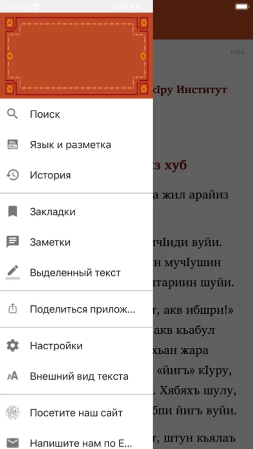 The app includes dictionary links to the key terms and a short glossary of key terms. Also includes audio for some Tabasaran texts (an Internet connection is needed for streaming listening or for the first download of each audio file to the smartphone's internal memory, with subsequent offline listening).