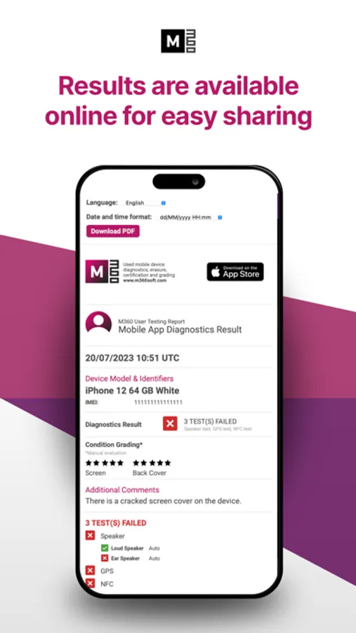 After completing the testing, you have the option to either receive the results via email or share them directly with a shop that utilises the M360 desktop application.