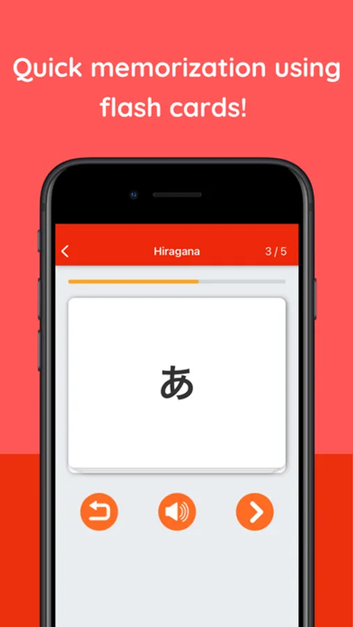 If you know how to read the character, swipe to reveal the next character. If you don't, tap on the card to know how it is read. There are two flash card modes: “Hiragana/Katakana → Roman alphabet” and “Roman alphabet → Hiragana/Katakana”.