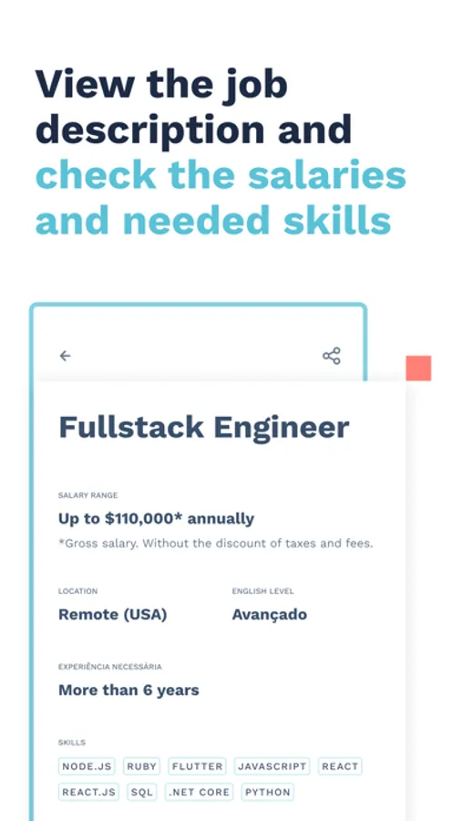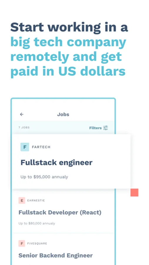It’s quick and easy: first, import your experiences directly from LinkedIn and make sure your profile is complete. Second, if your profile meets the requirements of our available jobs, one of our tech recruiters will get in touch with you and start the interview process so you can find an amazing remote job earning US dollars regardless of where you are.